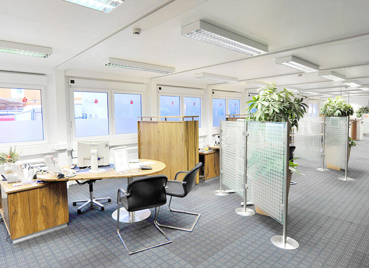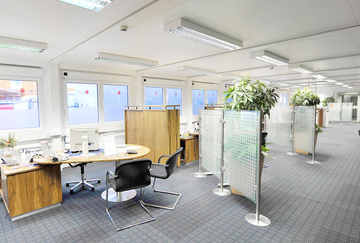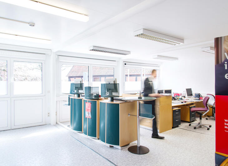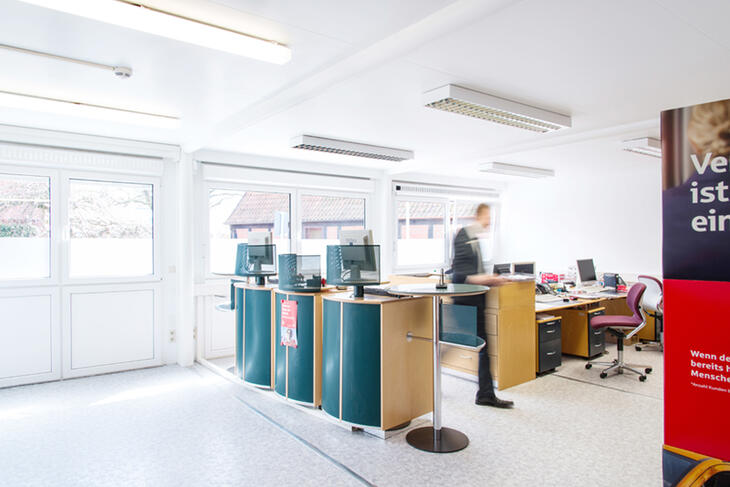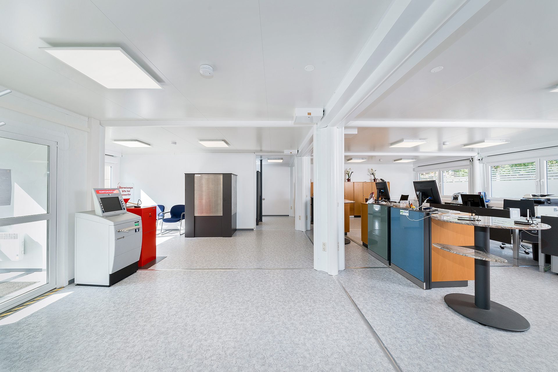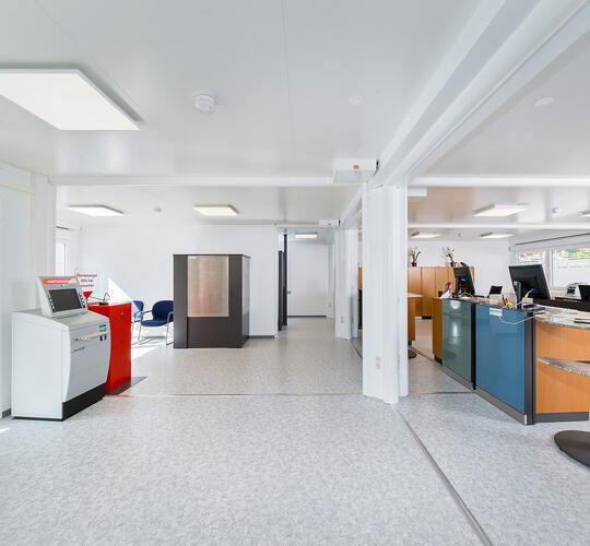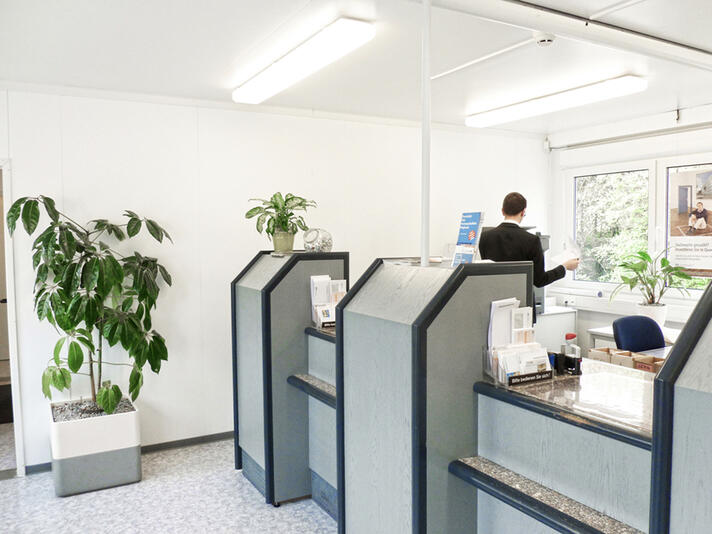 Skranken i en bank skal opfylde flere forskellige krav: Det skal både være indbydende og diskret. Den udfordring løser ELA Container med lyse og rummelige lokaler i sine mobile rumløsninger til banker og pengeinstitutter. ELAs modulløsninger, der enten kan købes eller lejes, kan leveres fuldt udstyret med stole og borde efter anmodning. Moderne LED-belysning oplyser den indbydende atmosfære i et skrankemodul til banker fra ELA Container.