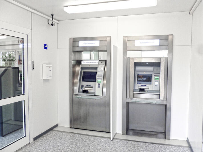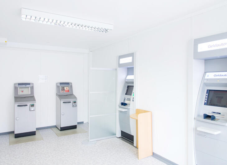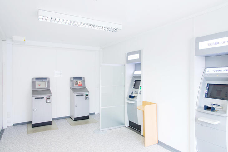 Som kunde i en bank med en midlertidige rumløsning fra ELA står alle muligheder åbne, også uden for bankens åbningstid. Alle økonomiske transaktioner kan udføres i ro og mag i ELAs moduler, der er indrettet som forhallen til en bank - 24 timer i døgnet. Her er sikkerhed et vigtigt aspekt, og ELA kan udstyre forhallen med LED-belysning, bevægelsesfølere og røgalarmer efter ønske. ELA kan også installere strømforsyning til overvågningskameraer og hæveautomater i sine rumløsninger til banker og pengeinstitutter.