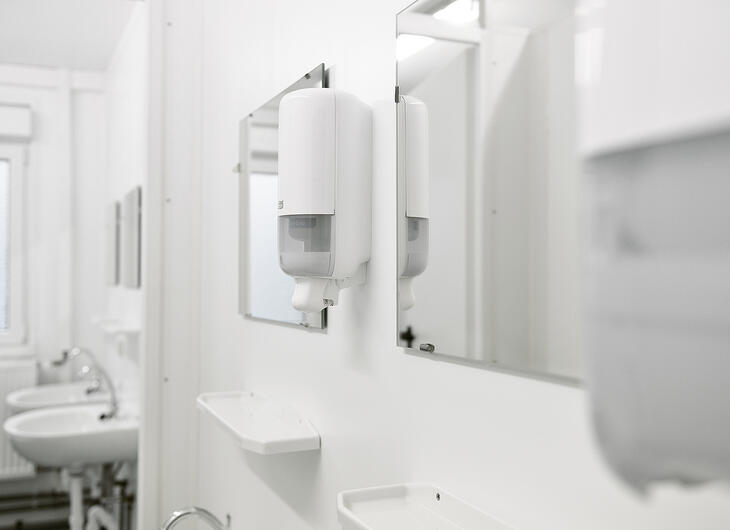 Available to rent or buy, ELA sanitary containers are impressive: Flexibly equipped with WCs, urinals, sinks, mirrors and LED lighting, they can be combined with container systems for any application either individually or as a complete sanitary area. The modern fittings and bright interior design make a good impression and are easy to clean, so teachers and pupils alike will feel at ease in sanitary rooms from ELA.