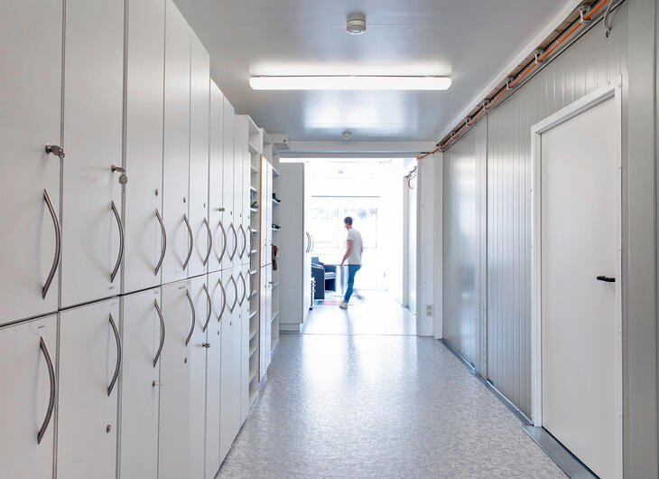 The individual rooms in a container system for schools can be connected easily with an internal corridor system. This saves space and makes it possible to move between classrooms in comfort, even ones on different storeys.